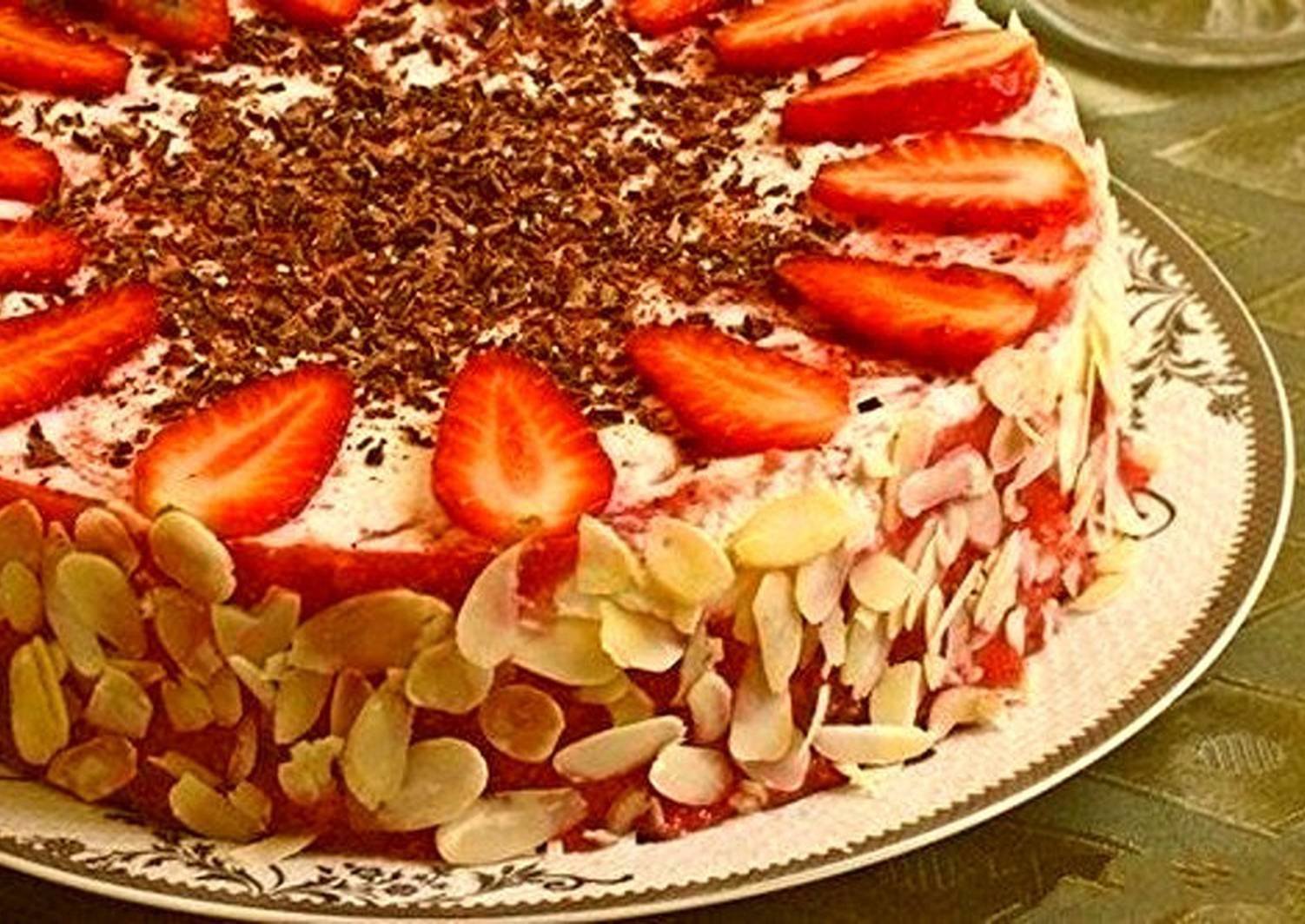 32. Картинка Украшение торта миндальными лепестками и клубникой